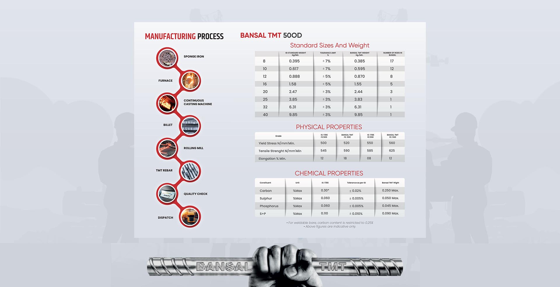 Dedicated and determined to elevate the infrastructure ecosystem, Bansal TMT launched the much-awaited 500D TMT Bars in 2013. These bars are exclusively designed for the high seismic zones, as these are furnished with a double rib and are comparatively more robust and enduring. The product catalog also includes FE 500, FE 500D & FE 550. Bansal Sariya stands synonymous with TMT bars in the markets of Central India.